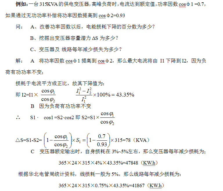 При недостаточной мощности в трансформаторах и линиях может быть использован метод установки устройств компенсации реактивной мощности.Установка устройств компенсации реактивной мощности может уравновешивать реактивную мощность локально, уменьшая ток, протекающий через линии и трансформаторы, замедляя скорость старения проволоки и изоляции трансформаторов, а также продлевая их срок службы.В то же время он может высвободить мощность трансформаторов и линий, увеличивая их несущую способность.Например, при трансформаторе мощностью 100 кВА, работающем в настоящее время при 85%-й нагрузке с COSΦ 0,7, установка оборудования для компенсации реактивной мощности может увеличить нагрузочность трансформатора на 30%.Пользователи могут увеличить свою нагрузку без расширения мощностей, чтобы облегчить дальнейшее расширение производства.